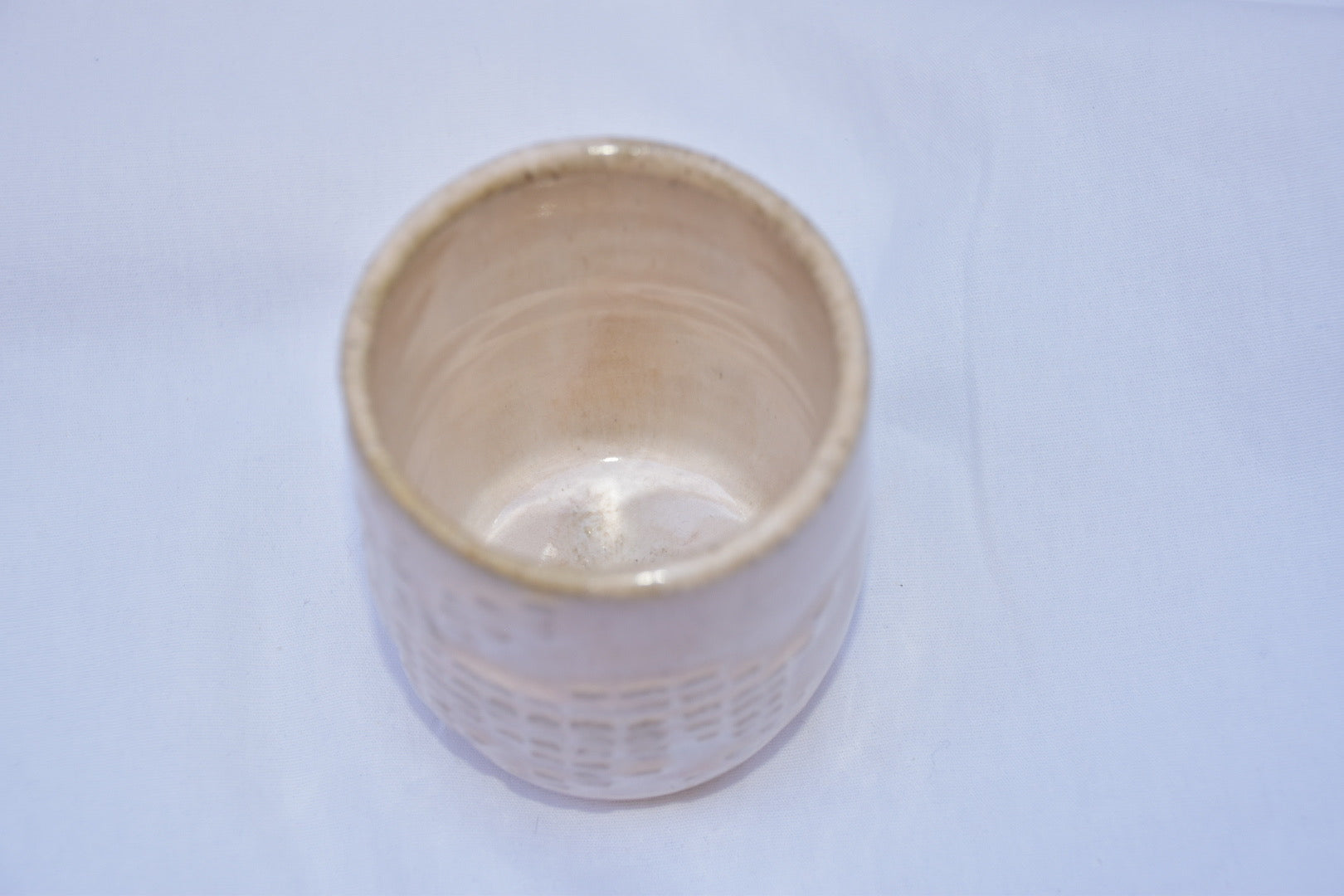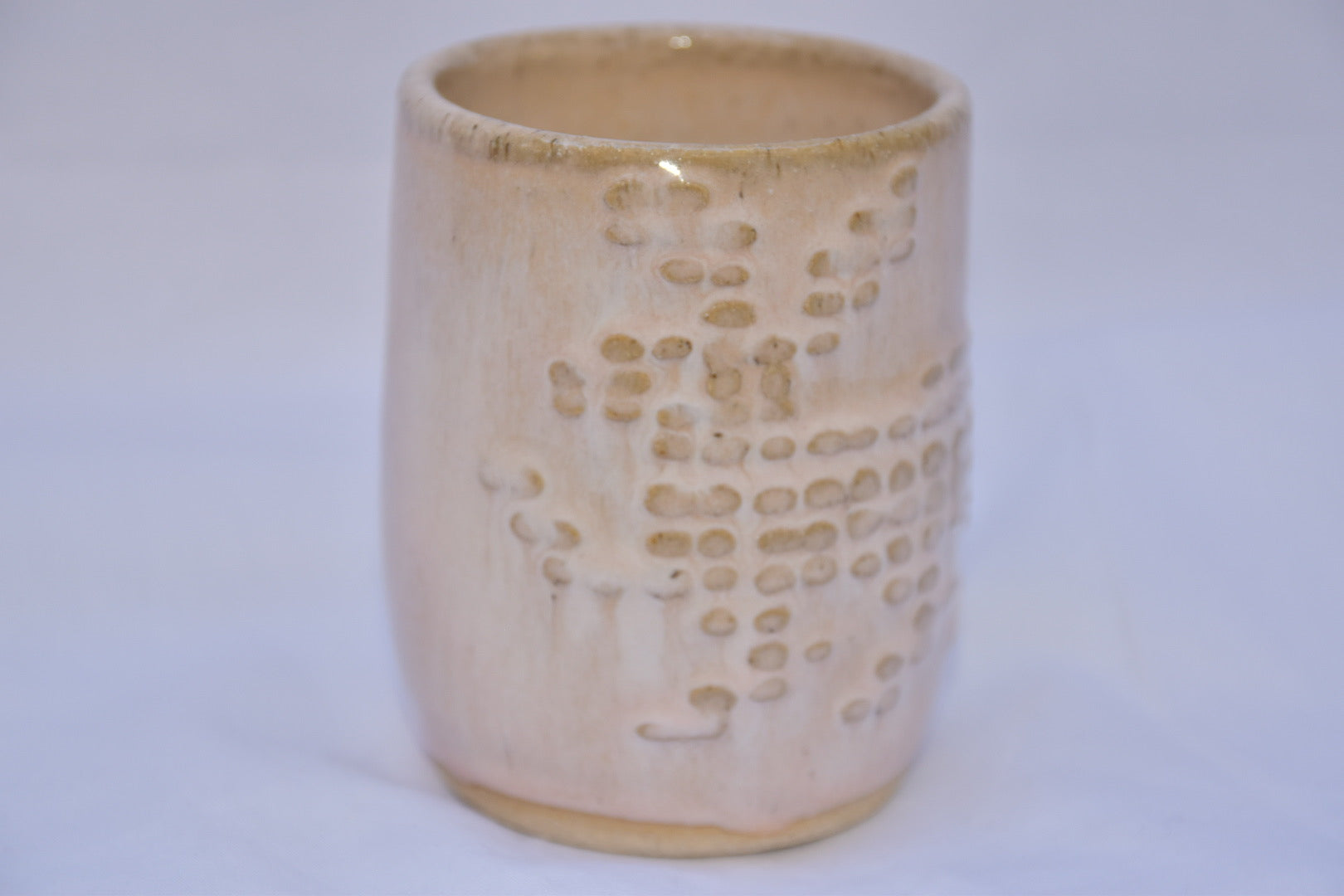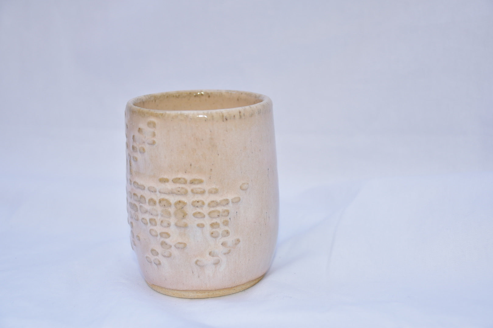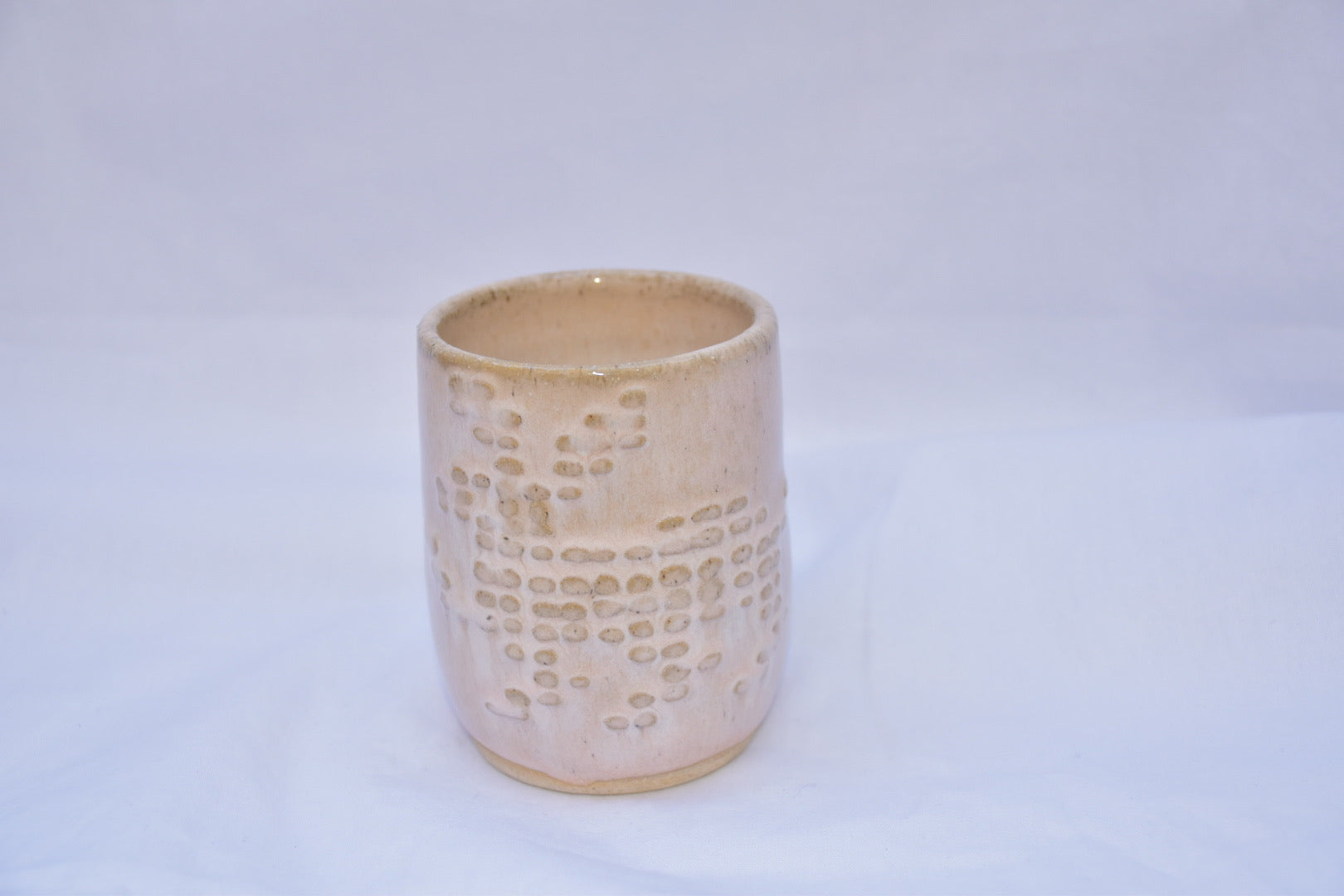 a small cup featuring a bunny design reminiscent of antique filet crochet patterns.