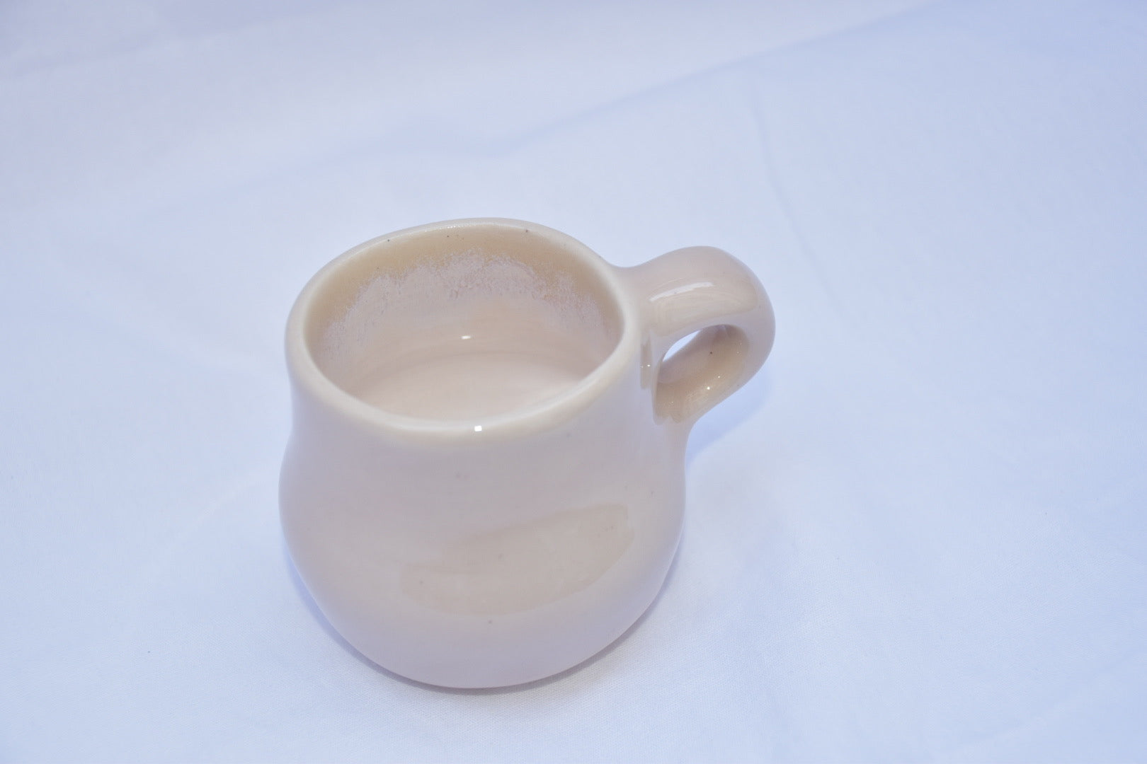 small espresso mug with tiny handle. perfect for one finger to slip through.