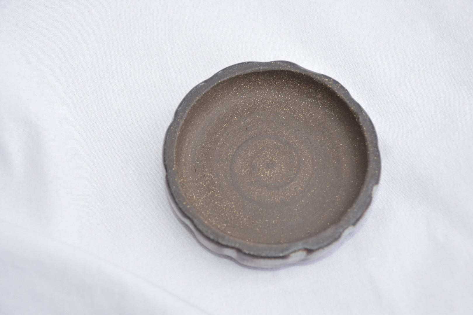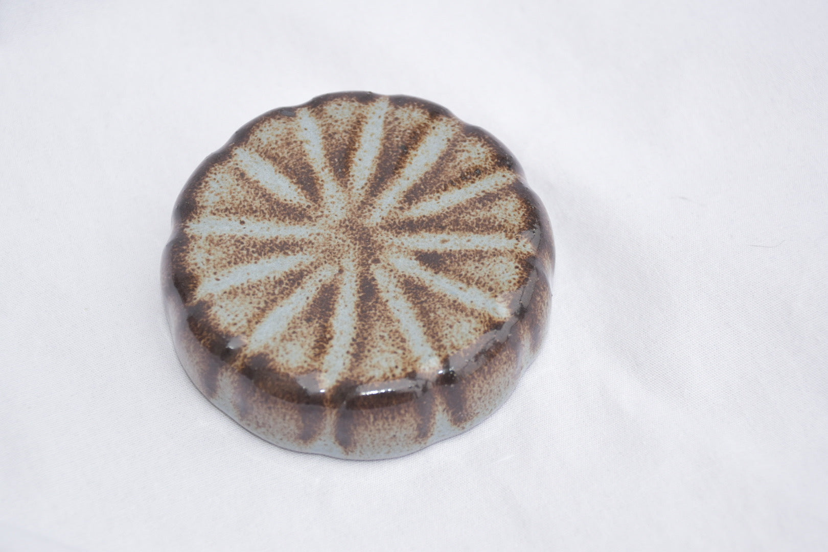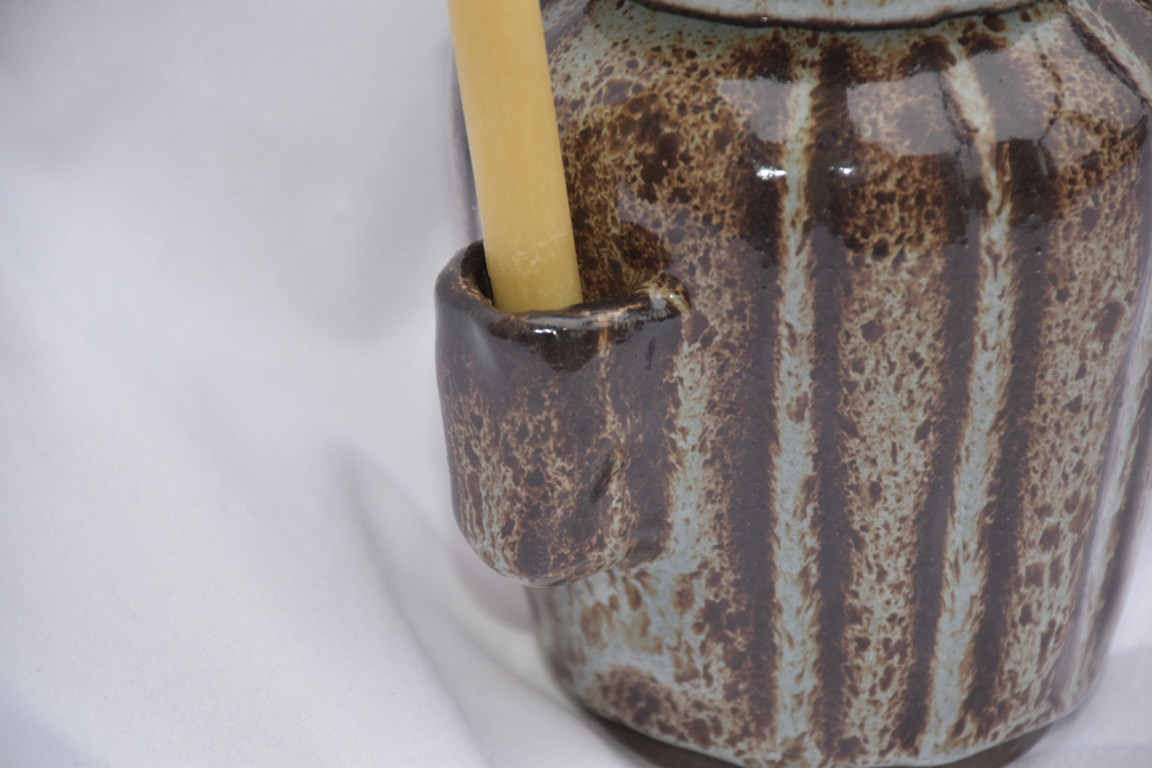 this jar is made out of dark brown clay. it was thrown on my wheel, trimmed, and hand carved. it has been glazed on the outside with a beautiful pale blue and brown glaze. the inside of the jar is glazed with a clear glaze that allows the stunning color of the clay to really shine (in my humble opinion).