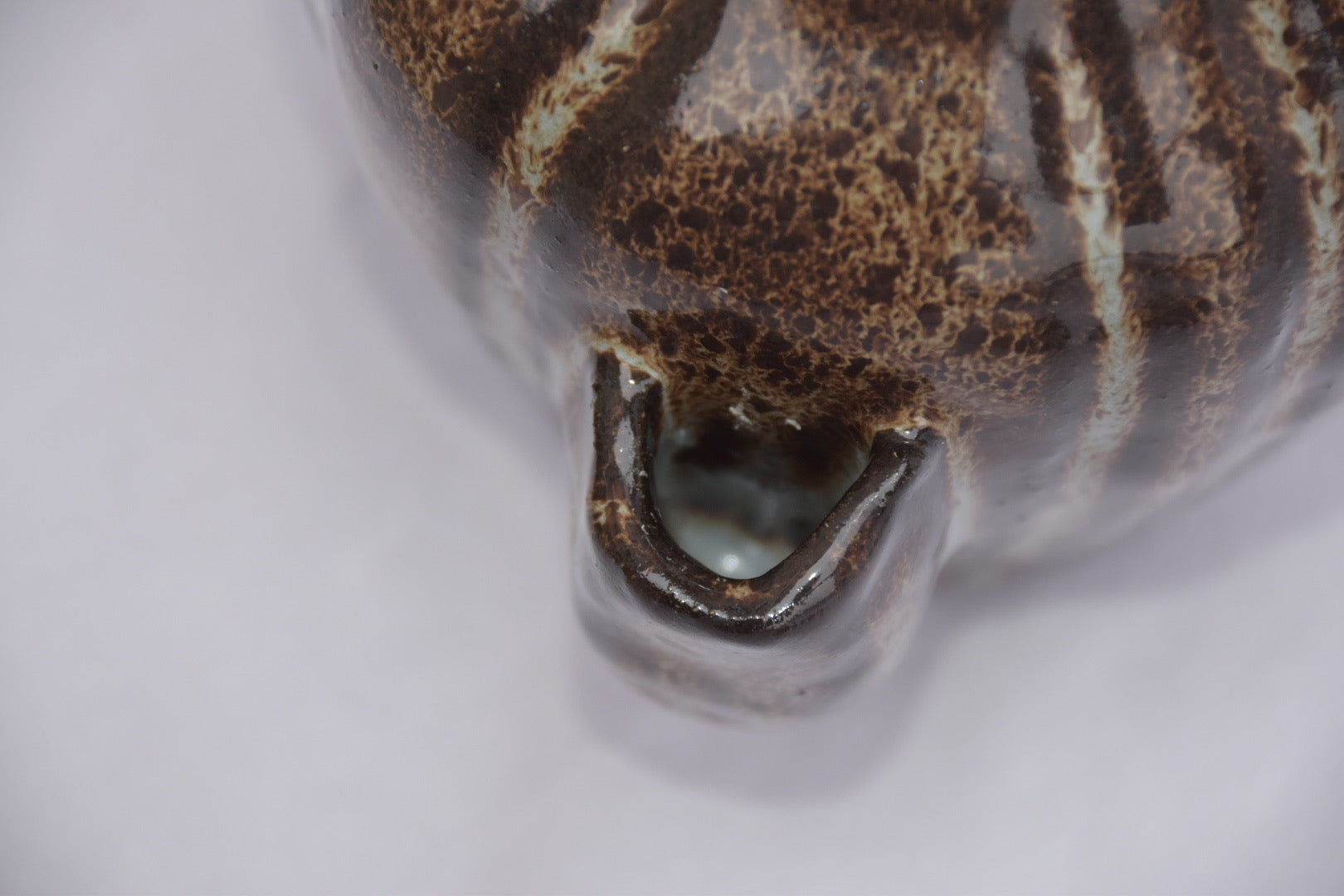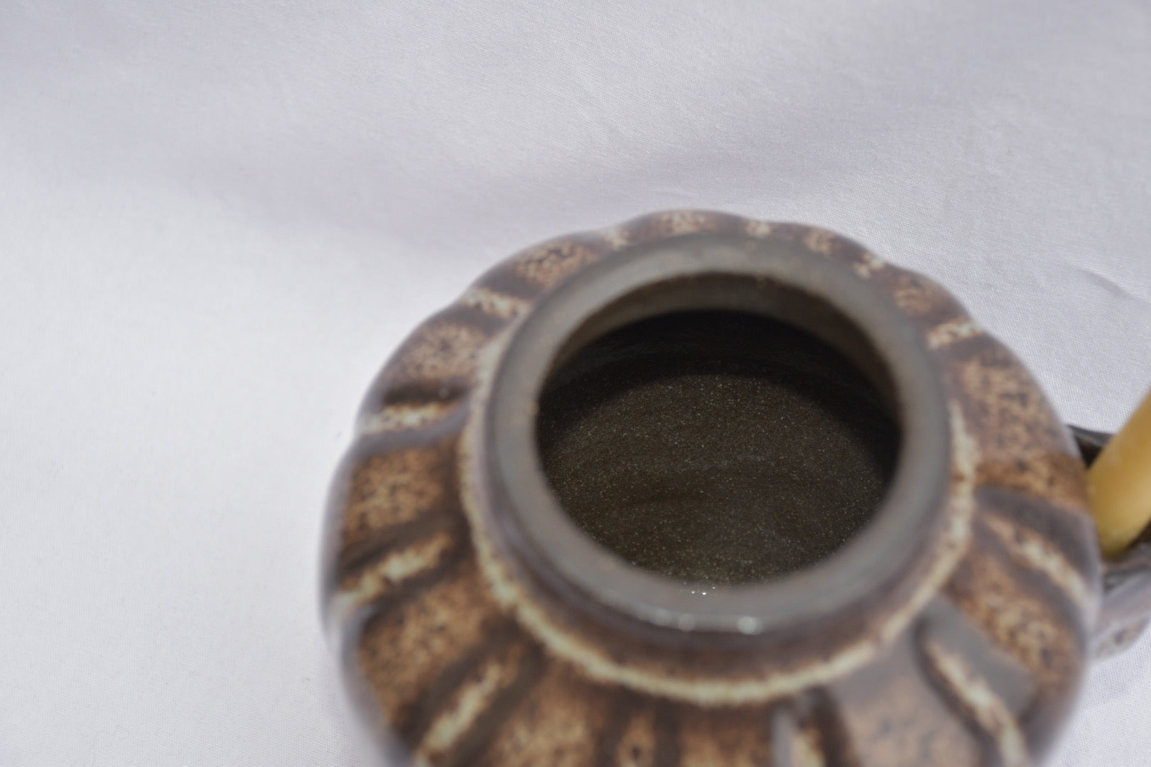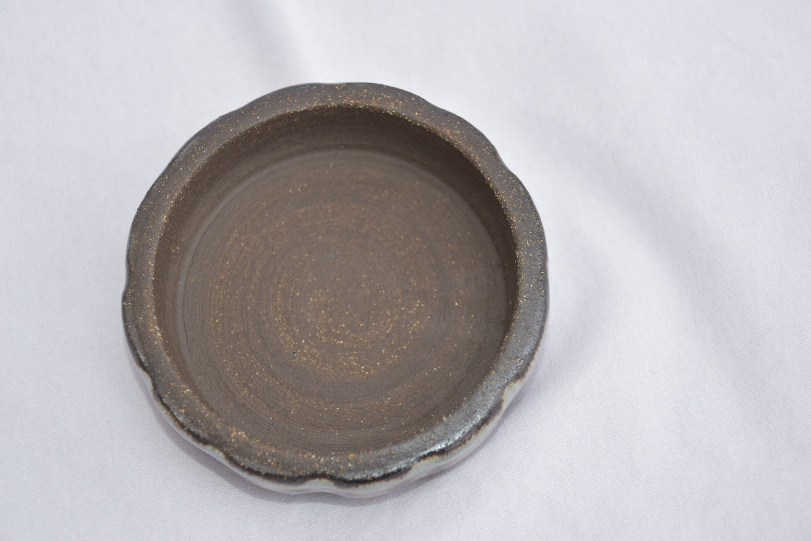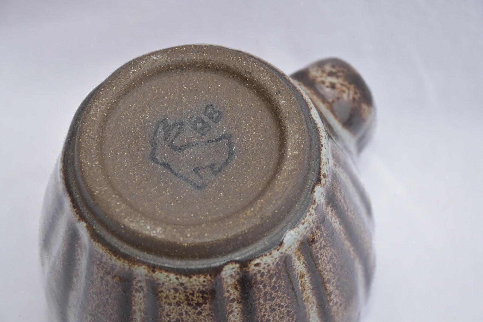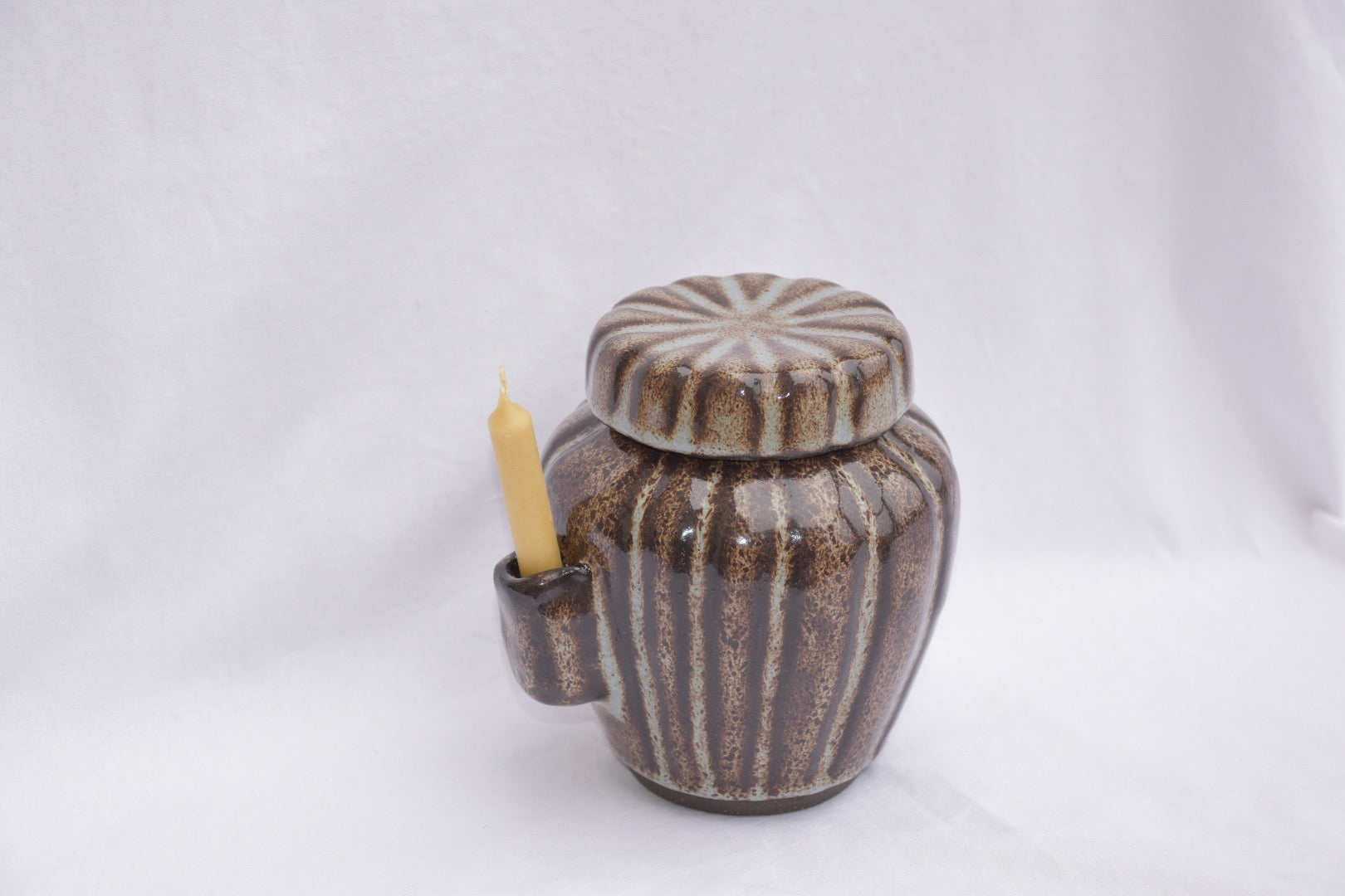 this jar is made out of dark brown clay. it was thrown on my wheel, trimmed, and hand carved. it has been glazed on the outside with a beautiful pale blue and brown glaze. the inside of the jar is glazed with a clear glaze that allows the stunning color of the clay to really shine (in my humble opinion).